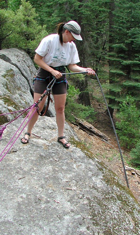 Sid ještě nikdy neměl tu čest s "živou skálou" a projevil přání naučit se alespoň slaňovat. Vyvázala jsem tedy lana přes dva mohutné kmeny (aby to Hrocha určitě udrželo) a chvíli jsme tam nacvičovali.