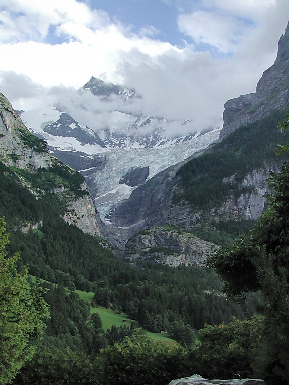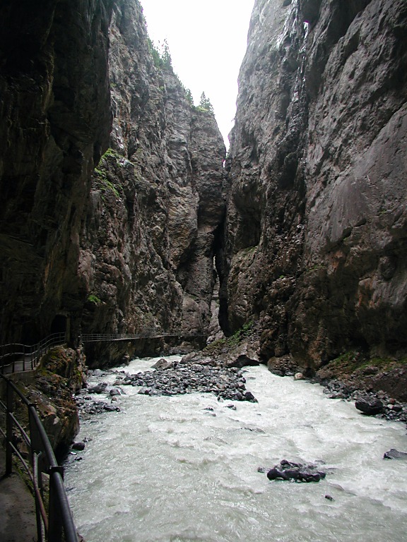 To nás sice potěšilo, ale pohled vzhůru potvrzoval, že vláčkem dneska vyjedeme tak maximálně do mraků a mlhy. Museli jsme vymyslet nějaký program vhodný pro maroda (tzn. žádné velké chození) - nakonec jsme si vzpomněli na soutěsku s horskou říčkou, kousek za městem. Říčka vytéká z ledovce pod Mnichem a Eigerem, má šedivou barvu a v kombinaci s tmavě šedými stěnami úzkého, hlubokého kaňonu dělá dojem pohádkové země Mordor.