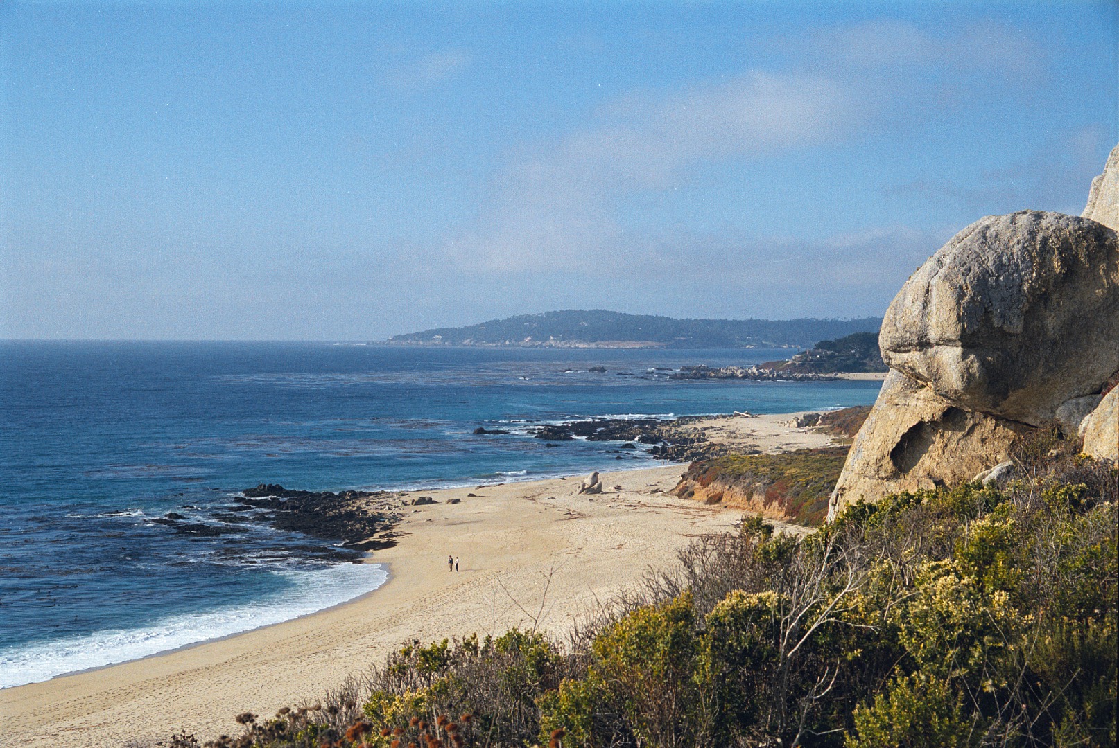 Nicméně pobřeží je nádherný, a — díky oněm nízkým teplotám — se nemusíte prodírat davy rudých břichoušů, nikdo na vás nepokřikuje se zmrzlinou či jinými plážovými požitky a jste ušetření řvoucích děcek (v koncentraci dvě děti na dvě míle pláže jsou tito tvorečkové roztomilí a pomilováníhodní). Byli jsme se podívat na pláž poblíž města CARMEL (opět Steinbeck), kde je nad pláží "oltář" — velký ztopořený šutr, u kterého se konávají svatby. Svatba se nekonala, konal se malý mužík rozevlátého vzhledu, pózující s elektrickou kytarou. Měl s sebou ještě fotografa, který celou romantickou scénu dokumentoval. Rozevlátec se na Sida sladce usmál a fotograf uraženě prohlásil "...oni asi nevědí, kdo jsi". Zrychlili jsme krok, abychom nevybuchli v hrozný řehot jim do obličeje. Fotograf vypadal, že by urážku svého přítele smýval klidně krví. O kousek dál jsem přiměla Sida k vášnivému polibku. Možná to ode mne nebylo pěkné, ale musím přiznat, že nyvý pohled (zajisté slavného) umělce se mi vůbec nelíbil — cítila jsem potřebu mu naznačit, že Sid je již zadaný.