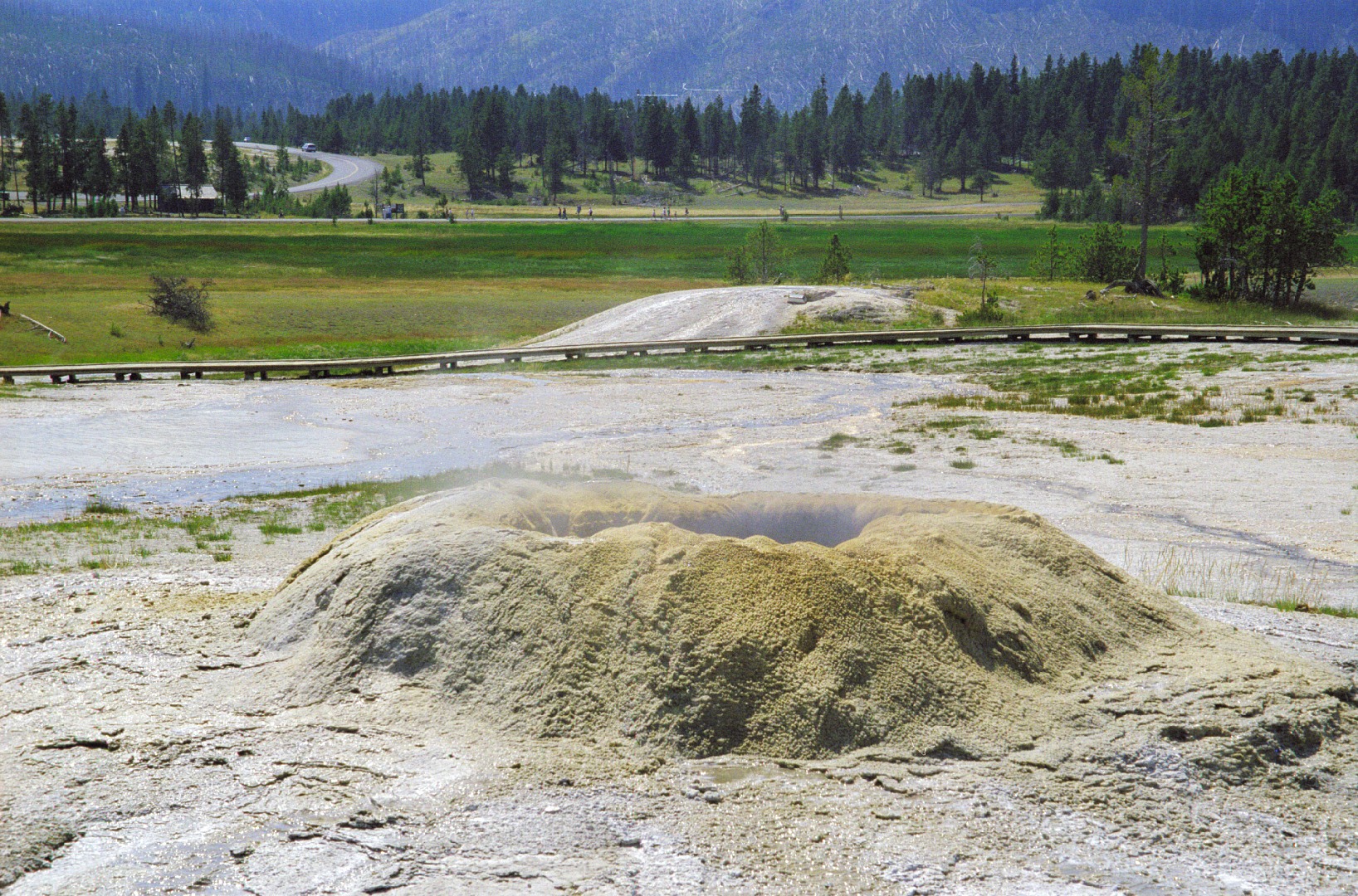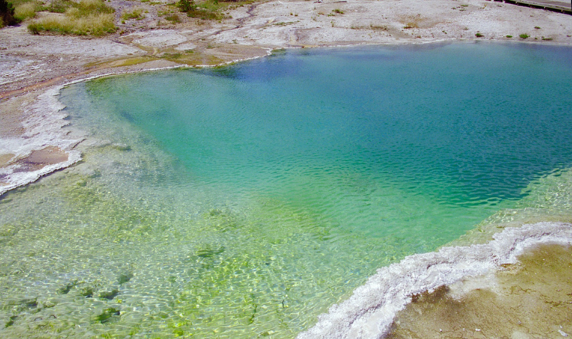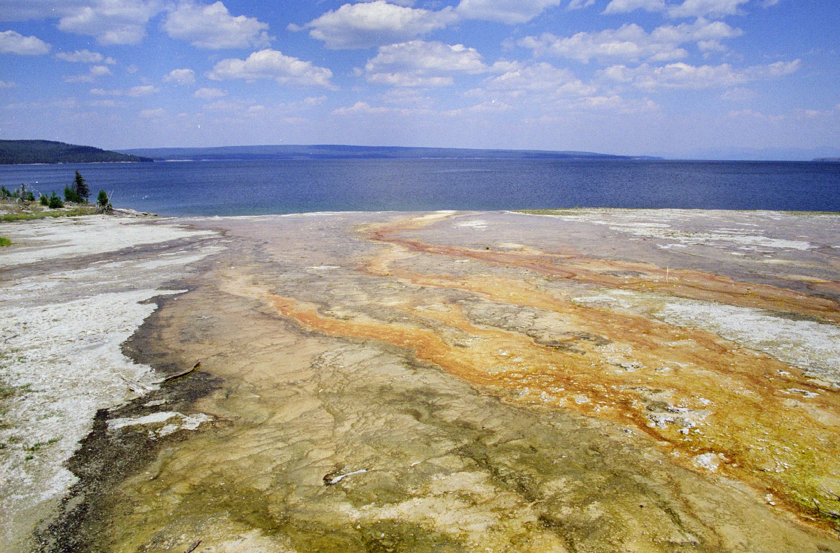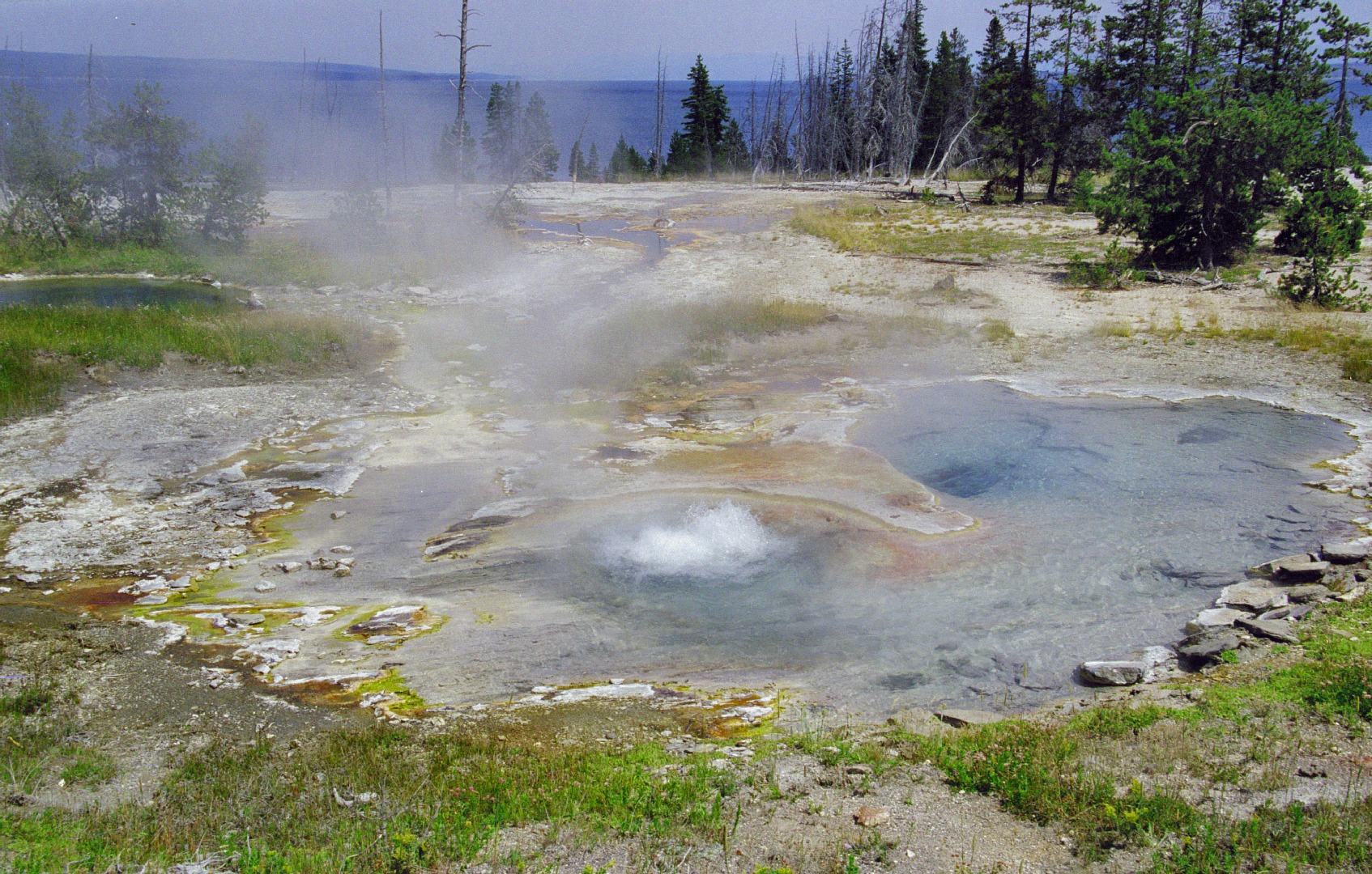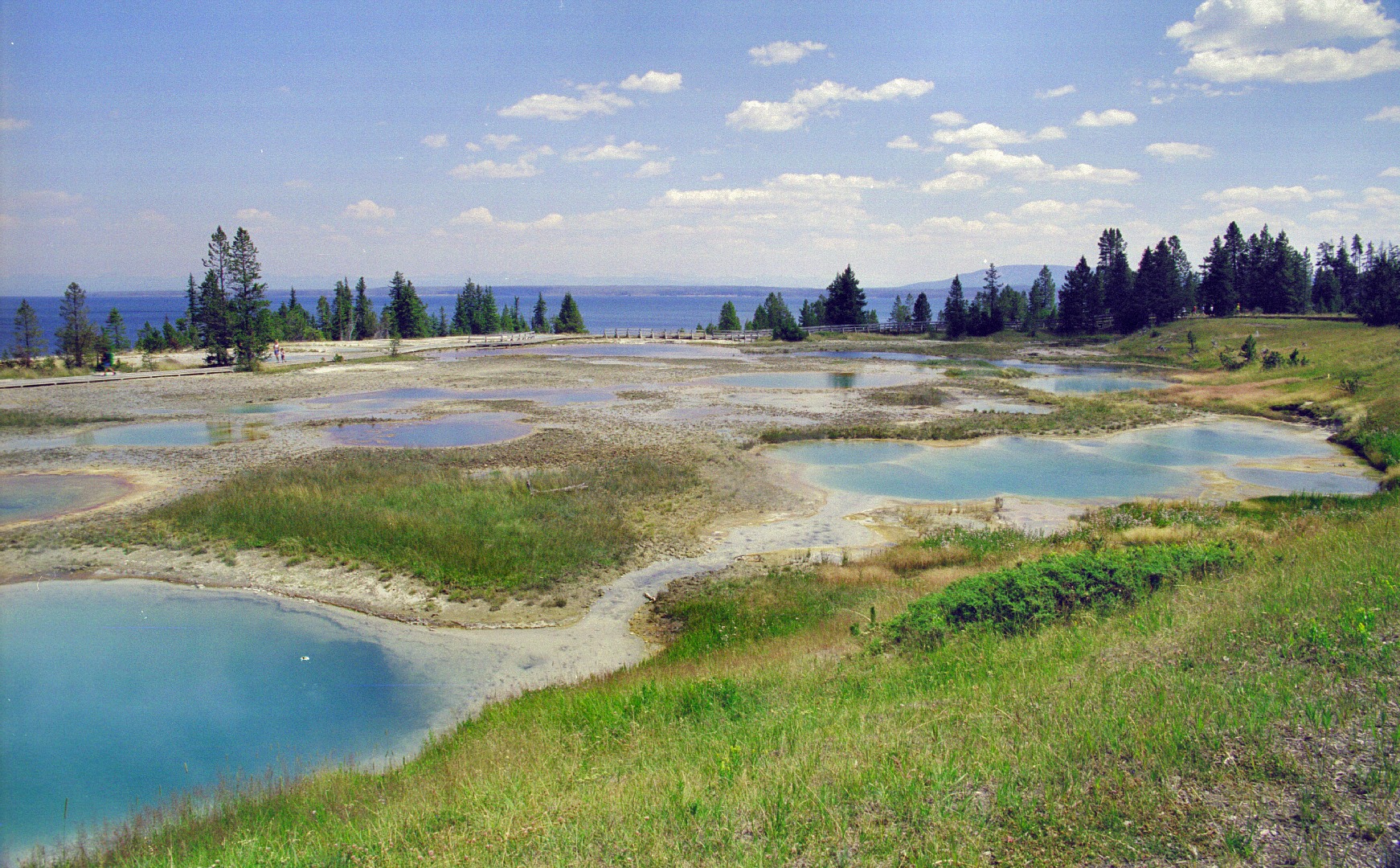 Přehrčeli jsme hranici Tetonu a Yellowstonu. Sid drandil přímo k Západnímu palci (West Thumb) a tam jsem se poprvé seznámila s pořádnými "prdíky". Smrdělo to ďábelsky, ale bazénky s čirou modrou vodou, olemovanou bílými solemi, přímo zvaly k vykoupání. Bohužel, pár týdnů po nás trojice Američanů tento nápad realizovala, nedbajíce varování, že voda má kolem 80°C. Myslím, že jedna dívka z trojice to nepřežila.