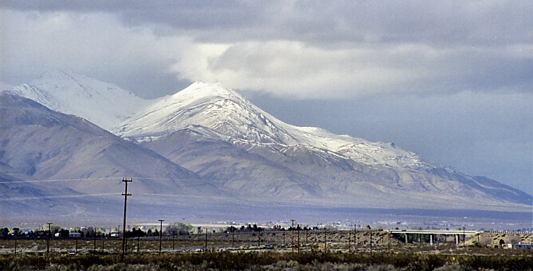 | On of the shiny summits of southern Sierra Nevada illuminates a grim desert at Ridgecrest |