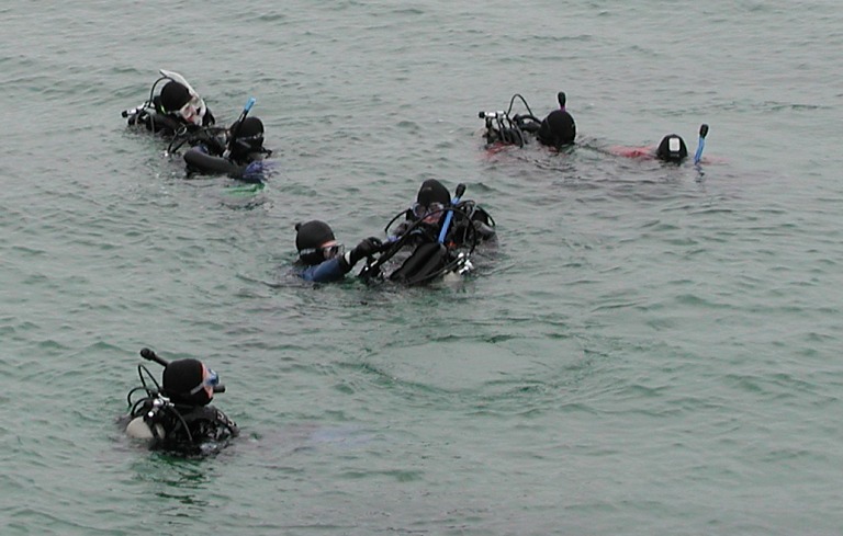 | We are exercising the skill of removing and putting on our BCD, on the surface. I am the diver in the upper left corner, with a blue snorkel tip. The ocean was even colder than it looks... |