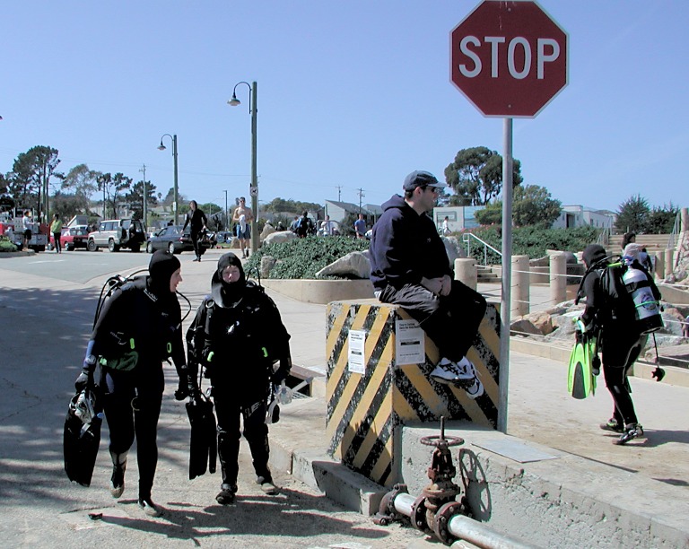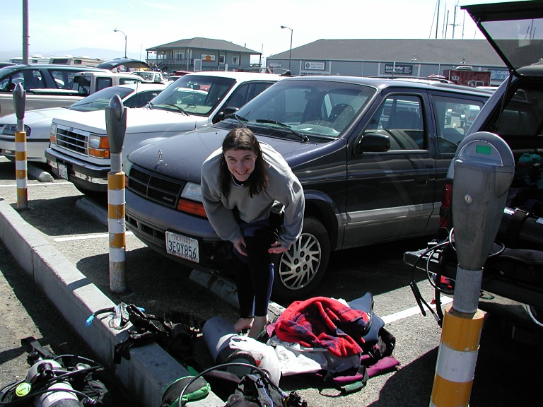 Morning was very hard, because of the time change we were getting up in the dark, and low clouds were rolling outside, above leaden Pacific... nothing was more remote than the idea of diving. Still we started out. At seven, Breakwater was half deserted, yet our class in full count - minus the instructor. We agreed to call him at 7:15. He showed up shortly before that, and disappeared again. I did not believe my eyes, when he reappeared in about ten minutes - grasping a hot chocolate cup from a nearby deli - he was getting that while letting us rattle off, dressed up in suits! The following training with compasses took an hour (I'm not kidding!!! we had to do it in 52°F, in howling wind and steady drizzle, we could not have done that back in school!). And then -- no, not a chance to go diving, to make it quick -- he announced half an hour for changing (all students were already dressed!). Some of that half hour I spend at the deli (fortunately everyone tolerated my wetsuit, wet from previous day), some inside Priscilla's heated car (Sid already left to continue sleeping).