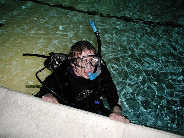 There were just two pool lessons left and then a weekend in Monterey, with four "real" dives. Sid came to visit during one pool session and took pictures of me in the suit. Even my very own mother did not recognize me on those photographs, and to be honest, after seeing them myself I am quite clear how lucky I must be that Sid married me before he saw my diving appearance.