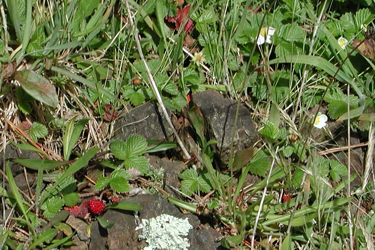 | All my cloak here is protection against wind. I'm bending down because I am seeking wild strawberries ... and the best ones sit right behing the fence to the water source area... |