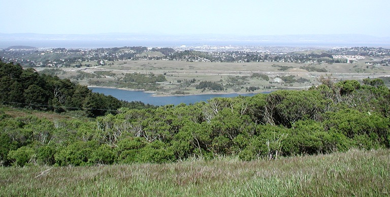 | A view to the Valley from Cahill Ridge - lakes with fresh (our drinking) water lakes, San Francisco Bay behind them, followed by another ridge. |