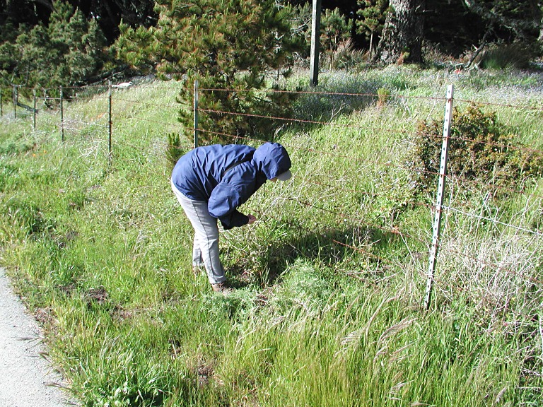 Speed limit 5 mph, we put on funeral faces and corresponding pace, dragging through. Cahill is a continuation of Skyline -- with similar arrangement -- ocean on one side, San Francisco Bay on the other. Just here it was devoid of people and we had an extra good view to Crystal Spring Lakes (one of drinking water sources for the Valley). A cold wind was blowing from the Pacific Ocean, but sun was warm. We walked along a protected water source area, gazing at wild flowers, disturbing some deer (they were all upset to be bothered by people), and we picked wild strawberries.