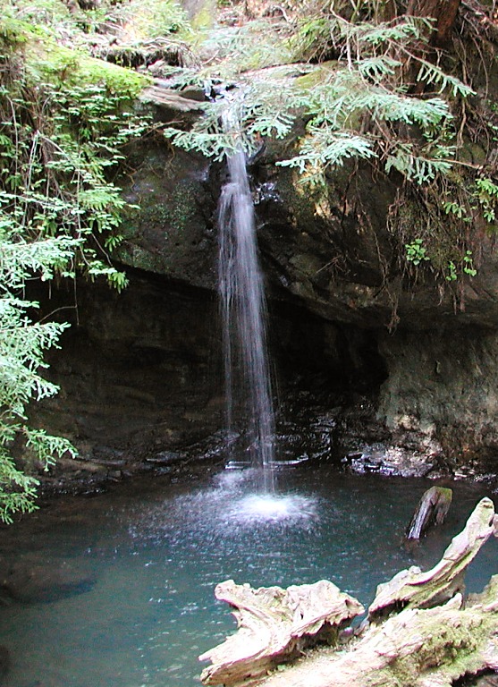 At Big Basin we chose a looping train about 6 kilometers long that included a waterfall. Though a parking lot was crammed full, in the end we were not encountering a lot of people, perhaps those four miles would be too much of a load on a family on a Sunday hike. The more we were to smell sausages being grilled on remote, fully occupied campgrounds, and once we caught a whiff of an intense aroma of burned vegetables... well, nothing beats eating out in the wilderness. We enjoyed it anyway, our trail led through a real rain forest, and the redwoods are simply grand.