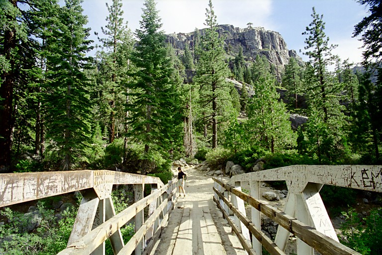 We also discovered in the morning that a roar we attributed to trains or some other industrial activity, which lasted through the whole night, did actually come from a waterfall deep in the valley under our hill. It seemed to be worth closer scrutiny, though it was actually an overflow runoff from Pinecrest Lake. We left our tent and sleeping bags and drove down.