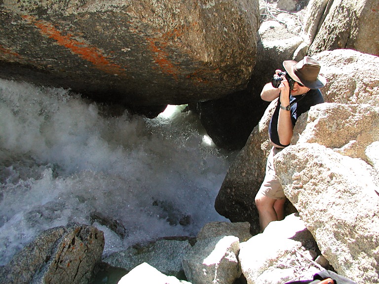 I insisted that we stop at the next waterfall, and so Sid obliged, quite thoroughly, I must say. A mountain creek was disappearing with a waterfall into a hole between giant boulders, presenting an overall scary impression.