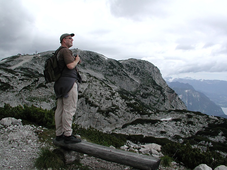 On our first day in the mountains, we went up on "Cripplestein", (the real name is Krippenstein). The funicular company gives you a discount (if you get there before 10 a.m. and if you stay at a local hotel); the ride consists of three segments: first ends in mid-slope, near the entrance to karstic caves, which Sid had seen before and did not find impressive (he claims that Moravian Karst is definitely better). The second segment ends on the actual top of Krippenstein, with a huge hotel and a restaurant - the destination of many "alpine sportsmen". The third cable section takes you downhill again to Gjaidalm plateau. Krippenstein is really a back side portion of the Dachstein range, and Gjaidalm is tucked between these two giants, like in a huge bowl.