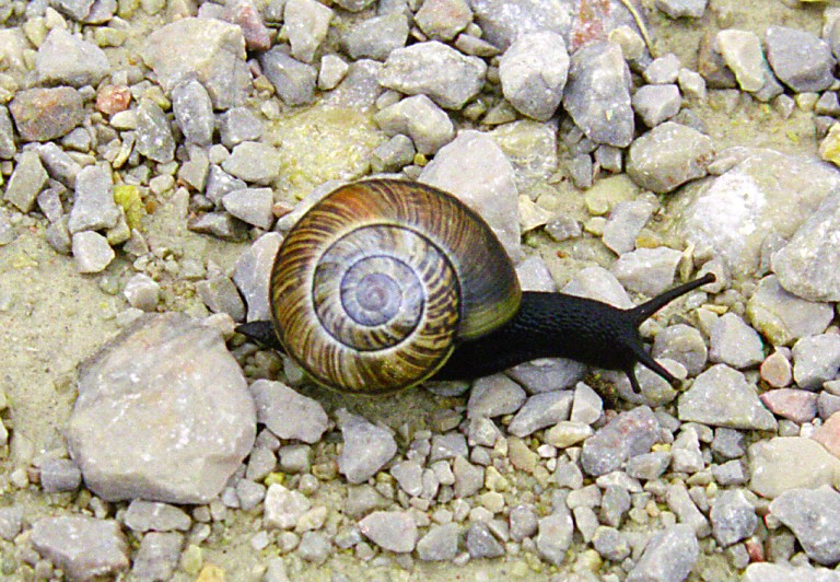 | This black mountain snail was merrily crossing a hiking trail. He did not at all try to hide in his shell, perhaps he wanted to be a star of our journal. |