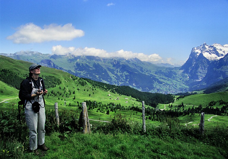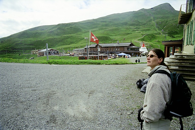 Our view from our dining room, where we ate our breakfast the next day, revealed a blue sky with a few playful clouds, and we merrily rushed to buy train tickets. I believe Sid got a full share of the train, eventually, but let me start from the beginning: first part of the way up, we could sit on the car, with practically no company, taking pictures of mountains slowly passing by. That lasted for about forty-five minutes, and was fun. The train disgorged us, however, at Kleine Scheidegg station, right in the midst of the real tourist meat-grinder. Picture a tiny station, overcome with rolling hordes of Japanese groups, other groups, and singular pilgrims. Everyone is clutching a backpack, a camera, those aspiring rough ones also wielding walking poles (very handy to provide support on paved platforms). Everyone keeps running up and down chaotically. Add untellible ruckle of station's public annunciators. We immediately felt compelled to step out to catch a breath, and hiked a little hill above the station, taking pictures of Eiger, virtuously wrapping itself in clouds.