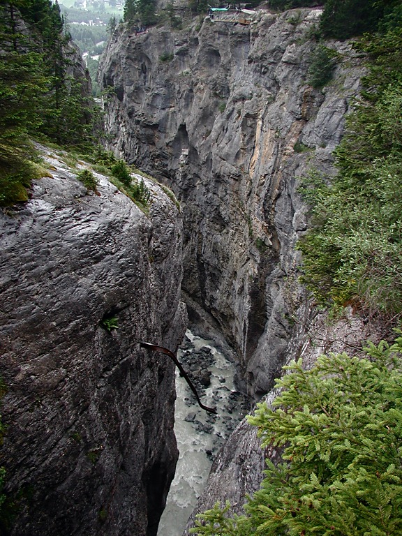 It gave us some hope, but looking up, we found that taking the train today would only bring us into clouds and fog. We had to invent some clever progam suitable for an ill man (i.e. no big hiking) - and we remembered there was a creek and a gorge right outside the town. The creek flows out from under the glacier between Mönch and Eiger. The water has a medium gray color, which, combined with dark gray wall of a narrow, deep canyon gives you the image of the fairy-tale land of Mordor.