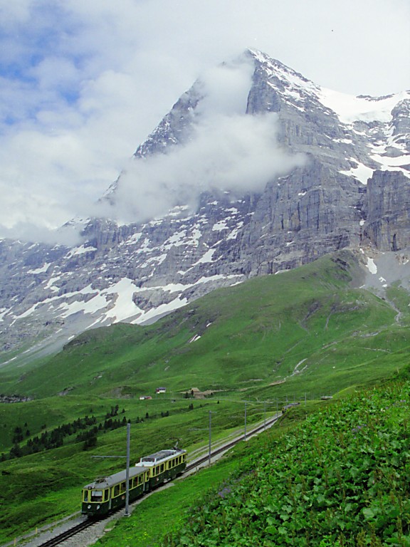 Situation was the same at Kleine Scheidegg - half-empty trains with "groups" vanished into the valleys, apparently unsuccessful in loading their designated companies, for our "free public" car got stuffed with additional fifty souls belonging to an organized Japanese expedition. It was a sensation - we managed with Sid to defend one emergency seat near the door, I sat on a half-butt, my arm wrapped around a rail at the door, the other stuck somewhere behind Sid's back, balancing a backpack on my lap, in some sharper turns accompanied by two Japanese women (who may have felt like home, only those guys who stuff people into their trains were missing).