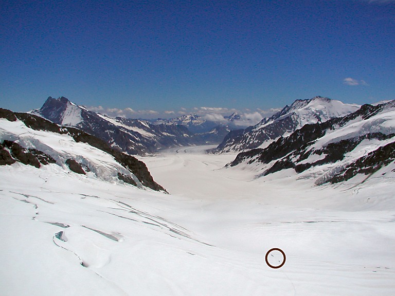 | A view to a glacier from Jungfraujoch -- those two little ticks inside a circle (on the enlarged picture if you click) are two tourist groups, one with two, the other with six people. |