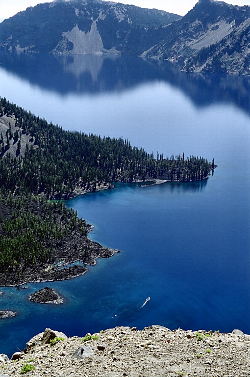 Last year, during our two-day stay, we drove around in our wagon, savored many vistas and paid a boat ride along the rim. The lake is 6 miles across in its widest direction (east-west), and 4.5 miles north-south. It takes almost two hours to circle such giant. Still, I strongly recommend the boat ride; if you take one of the early morning boats, you may ask to be let out on the Wizard Island and hike a cindercone to a crater (780 feet above the surface). I discourage people who don't understand English (I confess that listening to geological details for two hours was too much even for me), and advise against taking small children. A little girl, who was trapped with us on the boat, got on board holding her wet shorts in her hand (we did not learn if she got them wet herself of by sitting into water). She was awfully bored - until she found out that she could attract other people's attention by putting the shorts on her head, which made her mother hiss hysterically.