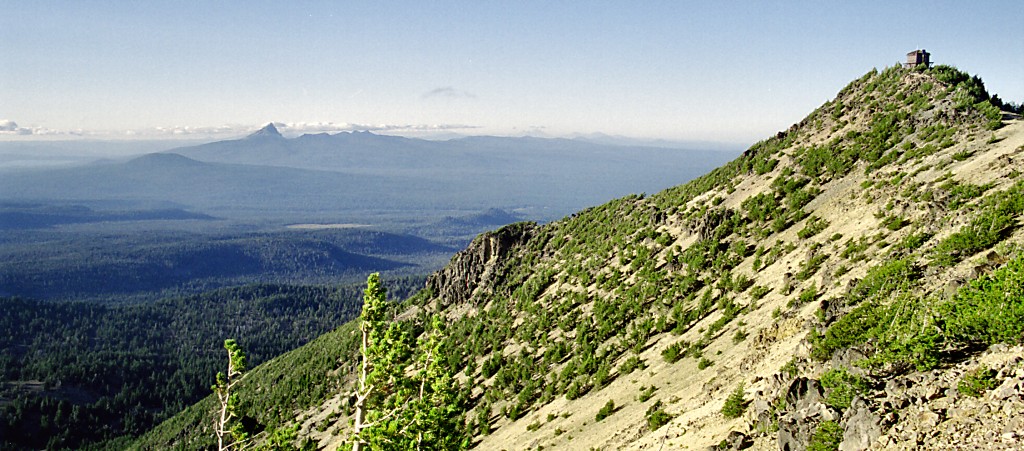 | A short distance from the top of Mt. Scott, on can well see a former fire watch lookout, and Mt. Thielsen in the background. Our tent is pitched somewhere in the forests below. |