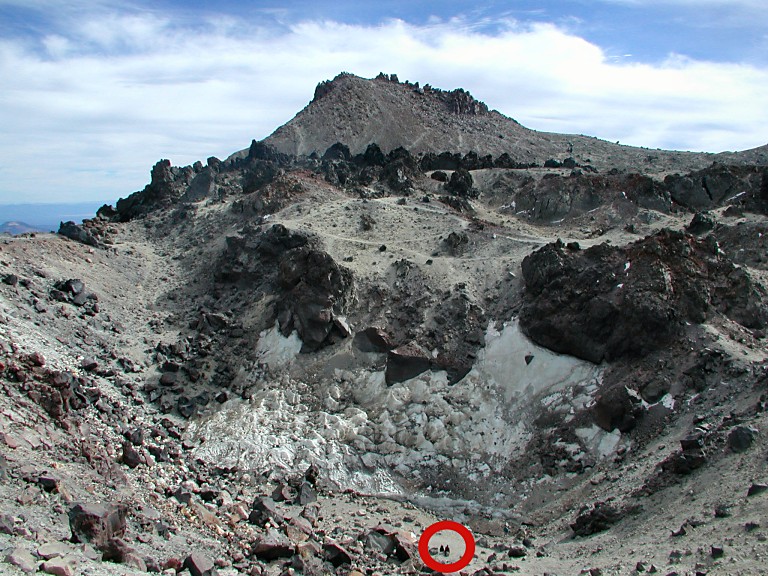 | Kráter v Lassen Peak - pro srovnání velikostí - na zvětšeném obrázku jsou v kroužku dva sedící turisté |