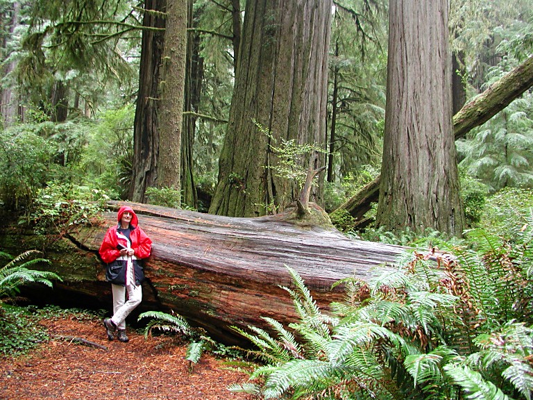 | Maminka v kapuci v dešti v redwoodovém lese - ani na pobřeží se počasí nezlepšilo, musíme na jih. |