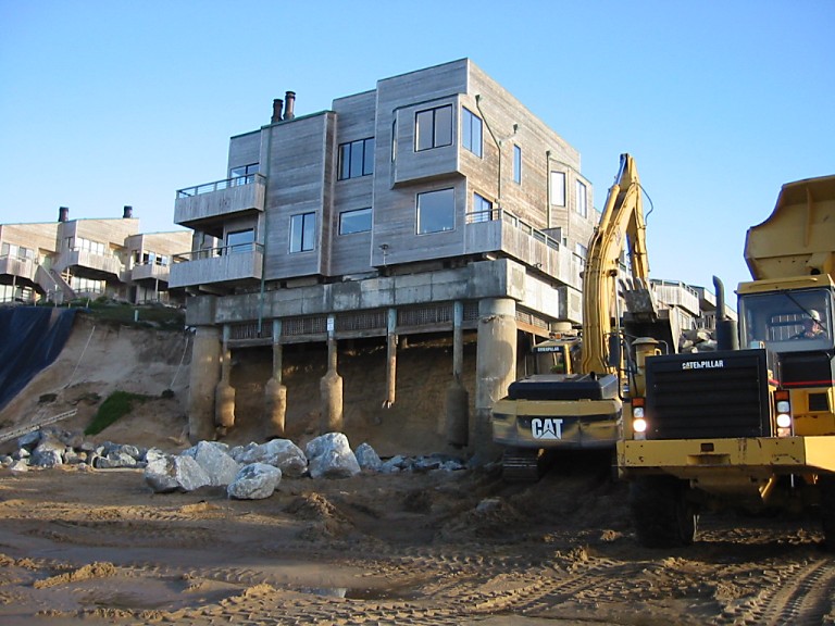 | Za přílivu Kření byt v Monterey (v patře) visí nad mořem. Za odlivu se nahrnou bagry a těžká technika a snaží se zachránit co se dá. |