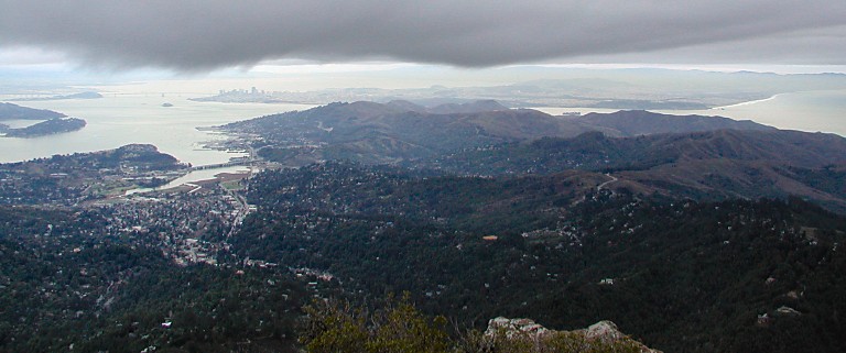 O víkendu kolem 15. prosince jsem sice z blížících se vánoc trochu znervózněla, ale přesto jsem nepropadla žádnému šílenstí a naopak v klidu odjela se Sidem na výlet na Mt. Tama (chuděra se jmenuje Mt. Tamalpais, ale nikdo není schopen to vyslovit, takže se všeobecne používá zkrácený název). Tama je kousek na sever od San Francisca, za Golden Gate. Je z ní (pokud se zrovna náhodou trefíte do jednoho z asi pěti dnů v roce, kdy není v SF mlha) výhled na centrum San Francisca, Bay Bridge, Oakland, Peninsulu, Half Moon Bay a celou zátoku - kam až oko přes smog dohlédne. Celá oblast Mt. Tama se skládá z různých parků a rezervací. Žádné soukromé pozemky, všude parkovišťátka a turistické trasy. Každé z nich vypadaly na poslední a nejvyšší, ale Sid mě neustále ujišťoval, že to ještě "není ono" a že musíme výš. A jeli jsme a jeli, až silnice končila u stánku s teplými párky. Tam stačilo opustit vlídné podnebí Vozíku, nabalit několik vrstev korunovaných větrovkou a čepicí a vrhnout se do mraku s vidinou vrcholu.