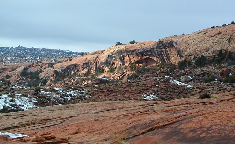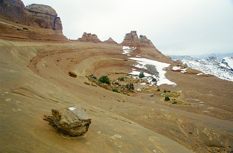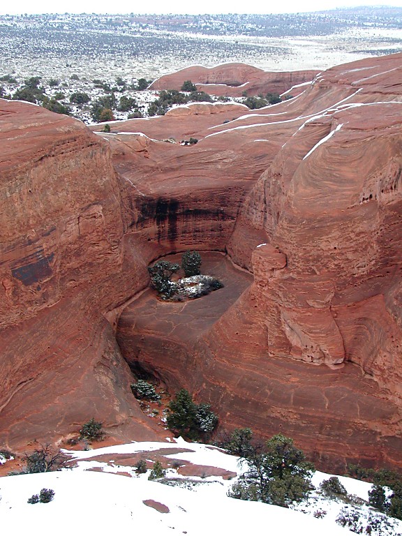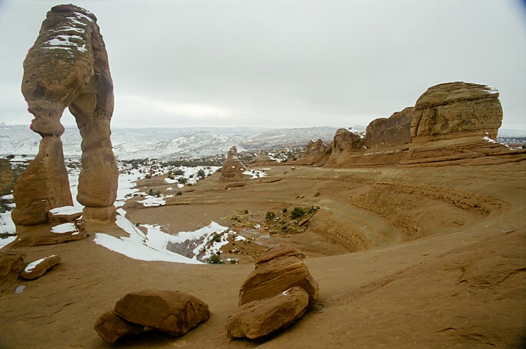 | Vortex Delicate Arch stojí na druhé straně vortexu, bokem k nám, téměř není rozeznatelný - snad jen díky sněhu na úpatí se dá vytušit. |