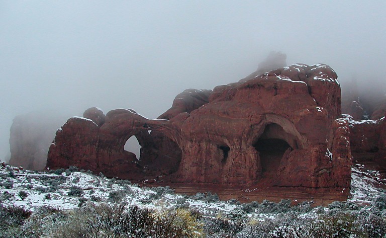 Double Arch jsme mohli obdivovat v intimní samotě, u North Window a South Window jsme se průběžně vystřídali s dalšími asi čtyřmi turisty. Od Turret Arch tvoří Severní a Jižní okno tzv. Divadelní kukátko - dvě oči uprostřed s "nosem". V našem případě bylo holt trochu zamlžené - zato davuprosté.