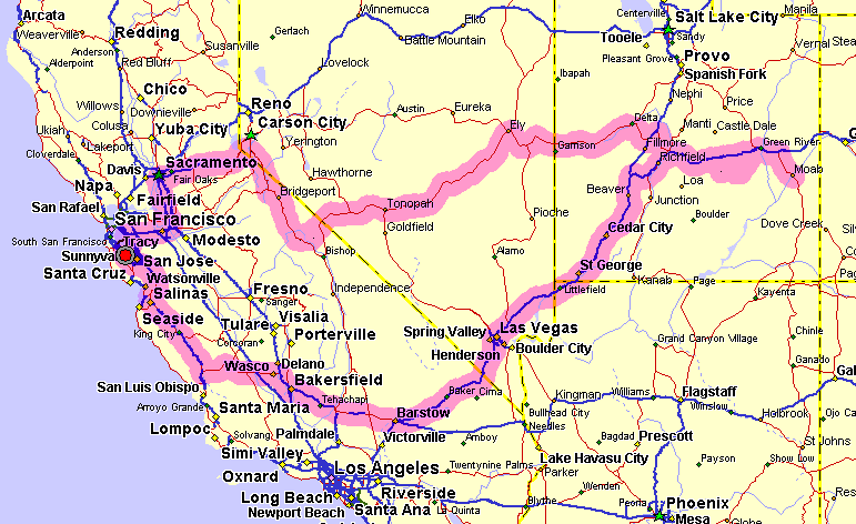 Sidova poznámka: jak jsme tak vyjížděli z mlhy, ocitli jsme se ve velikém, prosluněném údolí. Cosi divného se jevilo na silnici před námi, překážka typu - ani motorka, ani auto. Když jsme se přiblížili, spatřili jsme osobu, tedy muže, s dlouhými vlasy i vousy, s visionářským, neskutečným pohledem upřeným kamsi přes naše hlavy k čemusi výrazně jiné podstaty nežli pouhá dvojice cestovatelů pouští, řítících se v bílém autě. Kotníky mu svítily, jak svíral tyč poloprázdného nákupního vozíku -- v protisměru, na prázdné silnici, sedmdesát mil od nejbližší osady. Opatrně jsme jej objeli; i kdybychom jej vzali s sebou, jak bychom odtáhli ten jeho vozík? Nicméně jeho zjev poněkud posiluje fakt, že se to stalo severovýchodně od známé tajné Area 51, kde se prý dějí samé prapodivné věci. Jen čtěte dál...
