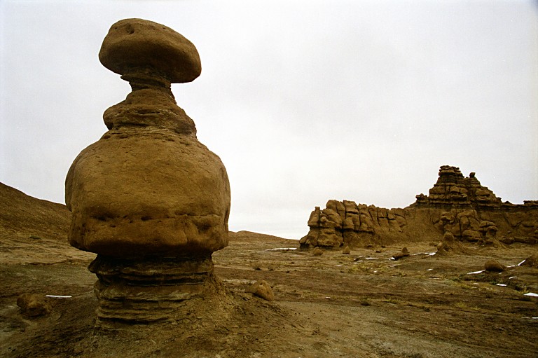 Goblin Valley je státní park - což znamená především to, že tam neplatí permanentka do národních parků. Museli jsme samozaplatit - na obálku s propisovacím vrchním trhacím listem vypíšete svoje údaje (značku auta), do obálky vložíte drobné, hodíte do schránky, utržený vrchní lísteček přilepíte na okno. Provedli jsme a za chvíli už jsem málem spadla do příkopu, protože u silnice stáli tři goblini. Přiznám se, že mi kulaťoučké velké hlavy připomínají spíš roztomile kýčovité figurky od Disneye než zuřivé sklaní skřety, o to veseleji se mi později mezi nimi procházelo.