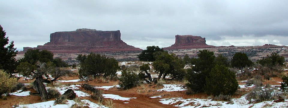 Na Silvestra, v pondělí, jsme se museli s Moabem rozloučit. Tisíc mil znamená cca dvacet hodin za volantem (čistého času) a to bychom asi na prvního celé nezvládli. Kousek za Moabem jsme odbočili na NP Canyonlands. Vychvalovaný park s úžasnými vyhlídkami se ovšem předvedl viditelností asi na pět metrů - i otočili jsme se a uháněli zpět. Když jsme dorazili pod hranici mraků, zlákaly nás zajímavé skály na obzoru k vycházce. Musím říct, že mormoni si vybrali krásnou krajinu - červený kámen, zelené stromy, bílý sníh - a když se zadaří modré nebe - úžasná barevná kombinace.