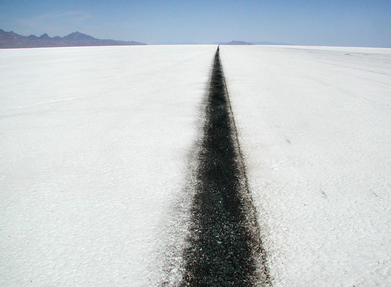 On the second day, Nevada desert began to appear somewhat stereotypical even for me. Crossing a border to Utah, we were rewarded by a view to a white, seemingly snow plain. An ancient lake of Bonneville dried out over ages, leaving layers of salt behind. They dissolve each year again in winter precipitation and dry back into a salty crust. There's less salt on the rims, tough desert bushes grow there, but the salt plain in the middle of the "lake" is huge, absolutely flat, stone hard. The whole affair has 44 thousand acres and always attracted people. In winter and spring it turns into a dangerous sludgy trap, in summer then transforms into a blinding beauty, with a specious "mirage". The surface is cold to touch, but hot air above in forms a mirror -- mountains, cars, bushes -- they all seem to float on a glossy liquid surface. One cannot look at the salt without sunglasses; after some twenty minutes of staying outside our car I found the light had slightly scolded my face. Naturally we could not resist and drove out onto the racing track -- maintained by climate (yearly cycle of watering and smoothing down) and Bureau of Land Management (sweeping a wide band of white "road" which is marked with sprayed black lines). It officially measures ten miles long and eighty feet wide. The vast flat plain welcomed first racers in 1896 - with cars and bikes, a first automobile - Ferg Johnson's Packard - came in 1911. Records started being measured in 1914 -- Teddy Tetzlaff reached 141 mph on Blitzen Benz. In sixties there records reached six hundred miles an hour.