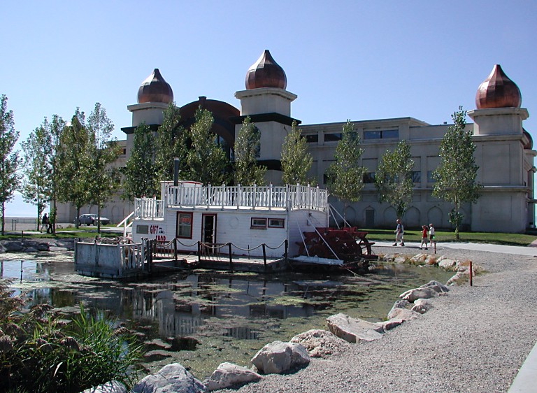 And it was not an end to all the salt. We returned to highway 80 and soon found ourselves in an infernally smelling reality. Utah's famous Salt Lake is home to bacteria that sometimes color its shores red -- and smell quite horribly. This very strong air used to be considered healthy -- to the point that Salt Lake City people had built a railroad going to air baths Saltair. A corny building looks derelict today, and is almost empty. Under huge domes, a few souvenir stands huddle next to a miserable refreshment booth for the few tourist that can't resist to explore the bygone luster. A muddy plain between the bath and water of the lake could not, however, lure us to a walk, after being to sparkling clean Bonneville. Salt Lake has no outlet -- water can only evaporate (while all the other things added by the large city nearby, stay in). Evaporation is not always enough for inrushing snowmelt waters in the spring and the lake used to overflow. Today, an elaborate system of pumps keeps the water level in check, moving excess water to another piece of desert, where it, ultimately, evaporates. That may be the reason for the muddy gap between the baths and the lake itself. This whole attraction made me feel depressed and sad, though.