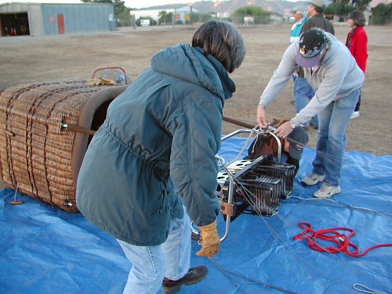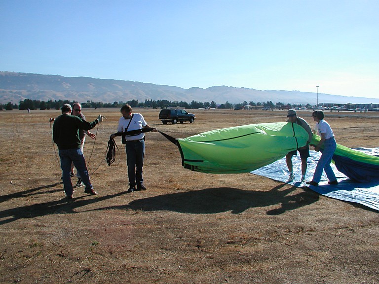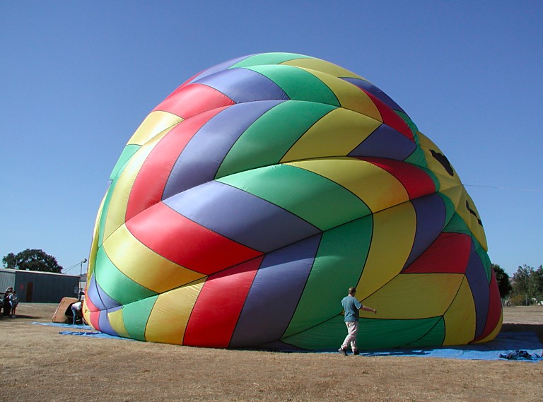 We carried out and assembled the basket, Brent tested burners. Then we unwrapped the actual balloon (a big bag), attached it to the basket and began to fill it with a cold air, using a small gas engine propeller fan. It surprised me that this (cold air) inflates the envelope to a practically full shape. Finally, one has to heat it up a little with a burner, and it's done. Clients hopped in, we took their picture, wished them pleasant flight, and turned around to see how Dana, who did not have any clients, managed to proceed with his balloon.