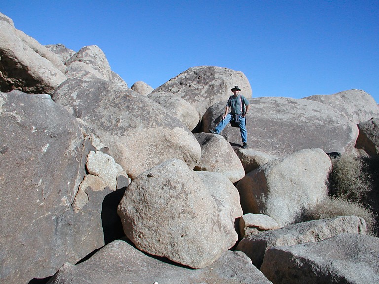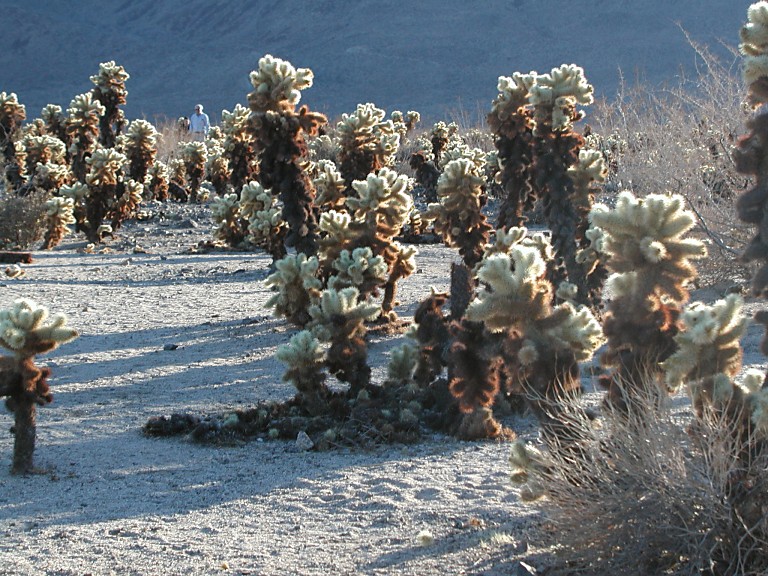 On our first day, we drove through California Valley, already darkened by nightfall, calling it a day in Victorville. Our first desert awaited us on the next morning - Joshua Tree NM. Péťa had never seen it before, we got here last time in 2000. It felt good to see the familiar combination of yuccas and round rocks. Unfortunately for us, holidays had lured out into this "raw nature" approximately half of able-bodied population of L. A.; we had to drive off on a dirt road to achieve any level of privacy. High heaps of giant rocks invited us for an exercise. Hippo gave up on one ugly flat, thanks to his slippery shoes, Péťa and I chickened out one story higher -- not that we would not be able to conquer a ten feet rock wall, but a combination of no ropes with sixty feet drop-off under our butts, did not make it seem a good idea.