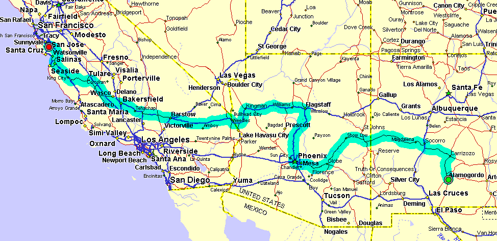 Zařadili jsme tajemnou Sedonu do seznamu "určitě důkladněji navštívit někdy po sezóně" a začali polykat část z oněch osmi set mil, co nás dělily od domova a nástupu do práce druhého ledna. Kolem šesté večer jsme přejeli hranici kalifornskou i časovou, povečeřeli v Barstow v podivném kříženci mezi americkým café a výbornou čínskou hospodou a v jedenáct se soukali do postele v předposledním volném pokoji v naší oblíbené Travelodgi v Tehachapi. Usoudili jsme, že když jsme právě přijeli z Nového Mexika a Arizony, kde mají o hodinu víc, tak se nic nestane, pokud si popřejeme do nového roku podle arizonských hodin, nikoliv kalifornských, a padli jak podťatí.