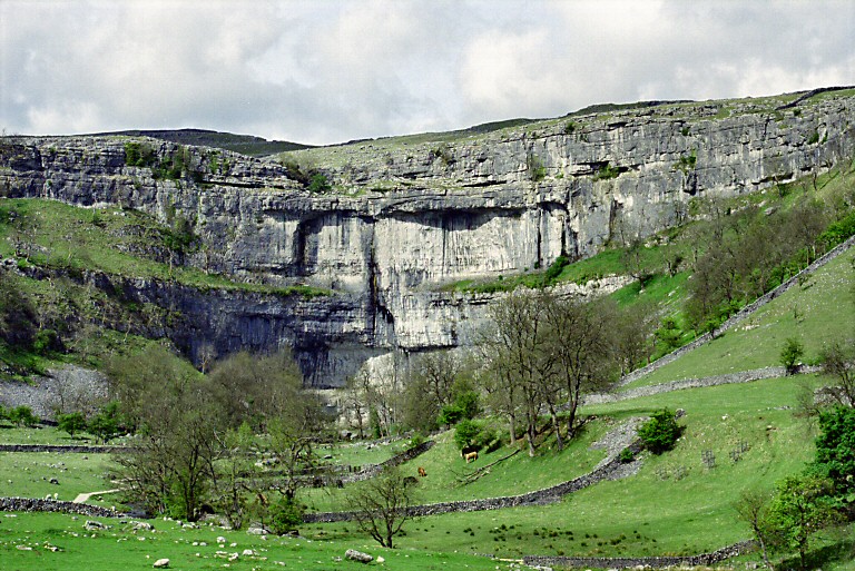 | Malham Cove a limestone cliff separating two different landscapes |