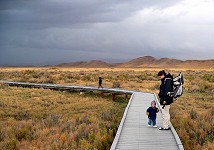 No a pak jsme jeli a jeli, až jsme dojeli do Carizzo Plain. Kolem blátivého slaného jezera Soda Lake vede krásný dřevěný chodníček na kůlech, právem jsme očekávali, že bude pro děti vítanou atrakcí. Tom i Lisa byli zcela nadšeni tím, že se můžou trošku protáhnout. Museli jsme je nabalit, protože foukal ledový vítr a nad jezerem se stahovaly černočerné mraky. Lisa byla spokojená, že má krásný "klobouk" (pruhovanou flísovou ušanku) a prima terén k lítání. Statečně zdolávala prašnou stezku, lovila s Tomem mravence a konverzovala s přerostlou trávou a kamínky a brouky. Pak nám Tom utekl, spatřil "dlouhý most" (chodníček) a vydal se na průzkumnou cestu.