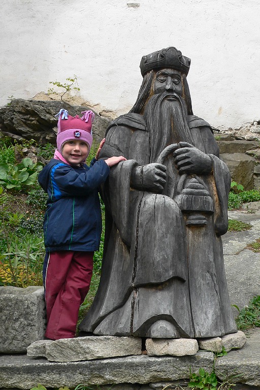 We said good-bye to our Brno grandma in the morning and drove back to the other grandparents and the kids. Weather got a bit more reasonable, though it was still cold in the Highlands. We put on proper clothes and drove out to Roštejn Castle. At such time on a weekday, there were no other visitors. We climbed up on the tower, checked out the courtyard, and eventually endeavored the guided tour of the castle. It was the first time we would take kids on such affair, and we were naturally worried that they'd cause a scene or even do some damage. Lisa lost interest toward the end, but the guide unlocked the next room and released us early to a wooden nativity scene. Lizzy liked it a lot and in the end did not want to leave.