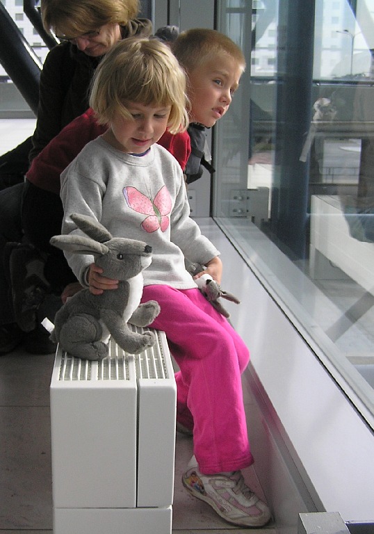 Lisa got up at inhumane three thirty, I managed to keep her in bed till four thirty, but then Tommy started getting up as well, and we gave up attempts to sleep on. Well, at least we were in time for the early express train to Brno and the other grandma. To our surprise, Lisa remembered since being two years old that granny from Brno played throwing balloons with her, and now insisted on doing it again. Our train maniac Tom settled at the window sill and watched street cars passing by. We took granny out with us to a playground — after juniors became unruly and it was obviously time for an outing.