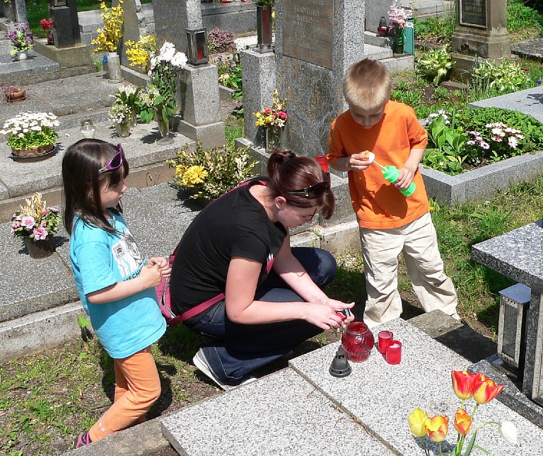 We went to the cemetery in the afternoon. We did not manage to be with our wider family, when our uncle died previous winter, so we only lit a candle. My grandfather and cousin are also buried there, and it was a kind of family visit. All went well, until on the way back Tom spilled his bubble-maker. A horrid howling ensued, so I talked Lisa into pouring some of hers to Tom's bottle. Clumsy Tom repeated the mishap. He cried so desperately and acted as a completely traumatized child for his spilled bubbles, until my puzzled cousins asked, whether bubble-makers are unknown or unavailable in America. Our way back to Prague got enriched by an experience with overstuffed bus. Fortunately granny managed to secure a seat for her and the kids, and I snuck into a seat next to the driver, from where he ejected any pensioners, so in the end only Sid had to flailed somewhere clutching a post. But we managed OK.