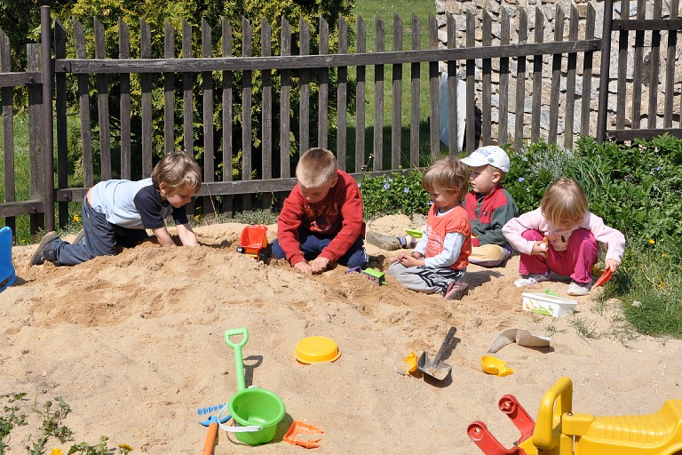 Hippo set out to Martina in the morning, who promised us a loaner car, I was packing and the kids played and watched TV. By noon we arrived in the Highlands, awaited by granny and grandpa. Tommy was fascinated by our back yard full of dandelions and asked for a dandelion crown like in the educational series Cubes (Kostičky). Then he dug in the sandbox, where he proceeded to dig for most of our remaining stay. He tried to entice Matt, our neighbor's boy, to dig with him, but Matt only had eyes for Lisa. It did not take long and Lisa and Matt were walking hand-in-hand everywhere, kept hugging, and parents' eyes moistened at the sight, with sentiment and laughter. Some things must be instinctive from birth — Matt was seriously showing Lisa their family possessions (a car), Lisa would coquettishly lower her gaze, and play shy.
