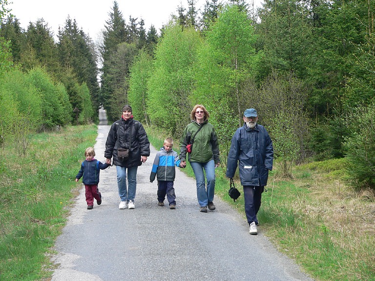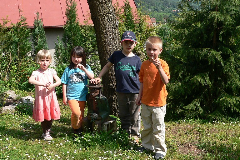 We planned to visit with Bára, aunt Věra and great-grandmother as soon as possible, but given the current illness outbreaks, our visit had shifted to the very end of our stay. Aunt Věra offered their cottage in Skalice, which was great, for juniors could stay outdoors there. She also cooked a superb lunch, and so, when fleeting Tom flicked around me, he was caught and sat down to the table. He protested very vigorously that he was not hunry, but I ignored it and went to load his plate. Coming back to the terrace with food for my children, I could not believe my eyes. Tommy, who wasn't, but really wasn't hungry, just finished last bites from my plate. It should be noted that I had loaded it with a rather large adult portion. In a moment Tom disappeared somewhere with Andulka and neighbor's Míša.