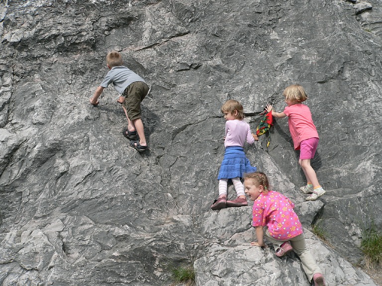 We organized a collective trip to climbing area Srbsko, in particular the old quarry Alkazar. By pictures, there were Nejdlý's, Martina and Péťa with kids, and probably our grandpa as well. I have no idea who brought the rope and quickdraws (Péťa, perhaps?), and I led Železitá (Irony, or perhaps the one next to it, which uses the same final rings, and DOES NOT have that difficult step over the edge), where everybody climbed subsequently — including Hippo and Tom. Most of the time, however, the kids played — three Elizabeths are worth mentioning — our Lisa, Blaka's Eliška and Martina's Elizabeth called Eliza. Naturally, the day was finished by a meal and more importantly ice cream bars at a restaurant near the railroad station.