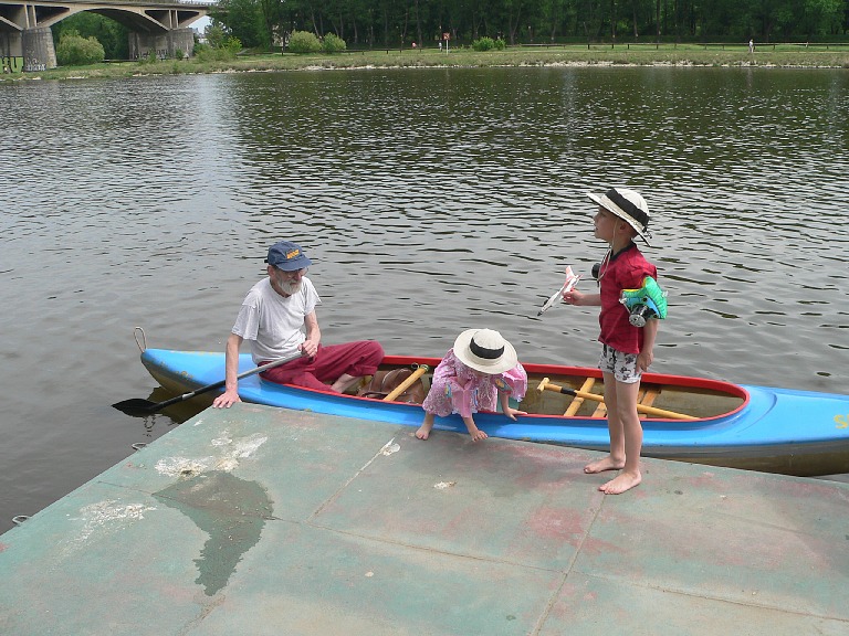 The weather cooperated and we executed an all-day outing with grandpa in Chuchle. This included engaging Sardel (Anchovy), an ancient canoe that in the past took us down may rivers. This time we just carried it a few yards down to Vltava. I was a bit worried how the kids would handle a tipsy boat, but it was a great success and grandpa did not seem to lose his balance by his grandkids. Tom has been convinced since that he had steered the boat, for he sat up-front.