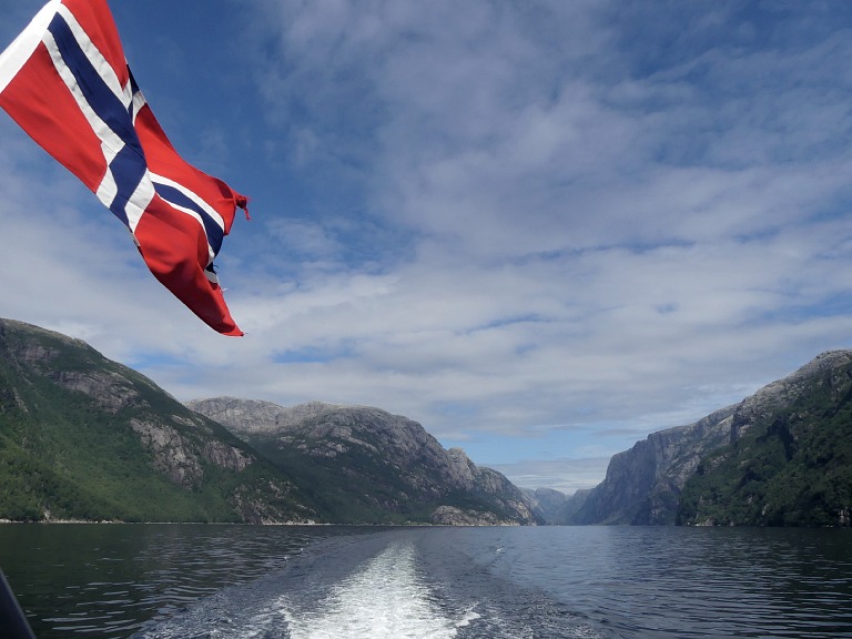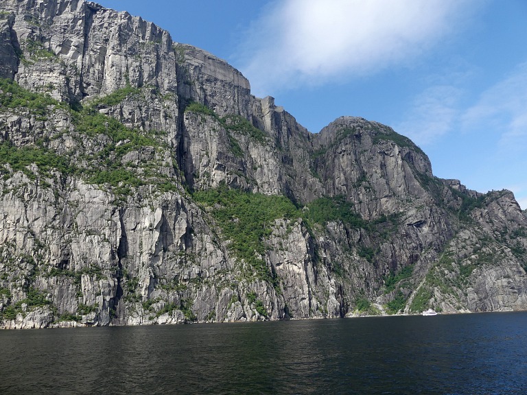 Lysefjordu. Takhle z vody to bylo zase něco jiného, vynikala výška skalních stěn